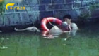 男子发现鸭子被冻湖面 跳湖破冰救援