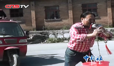 贵州牛人大胆表演:眼皮挂水桶 颈部架刀拖车