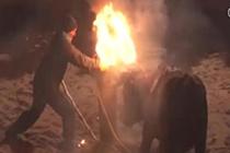 西班牙“火牛节”牛受罪 头顶烈火撞桩而死
