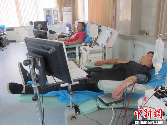 4日上午,大批长春市民来到中心血站献血,支援宝源丰禽业公司火灾中的伤患救治。图为市民在进行献血 陈博宜 摄