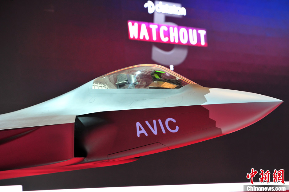 11月13日上午,第九届中国国际航空航天博览会在广东珠海开幕,一架中国先进战斗机概念模型在中航工业展台亮相,备受关注。中新社发 陈文 摄